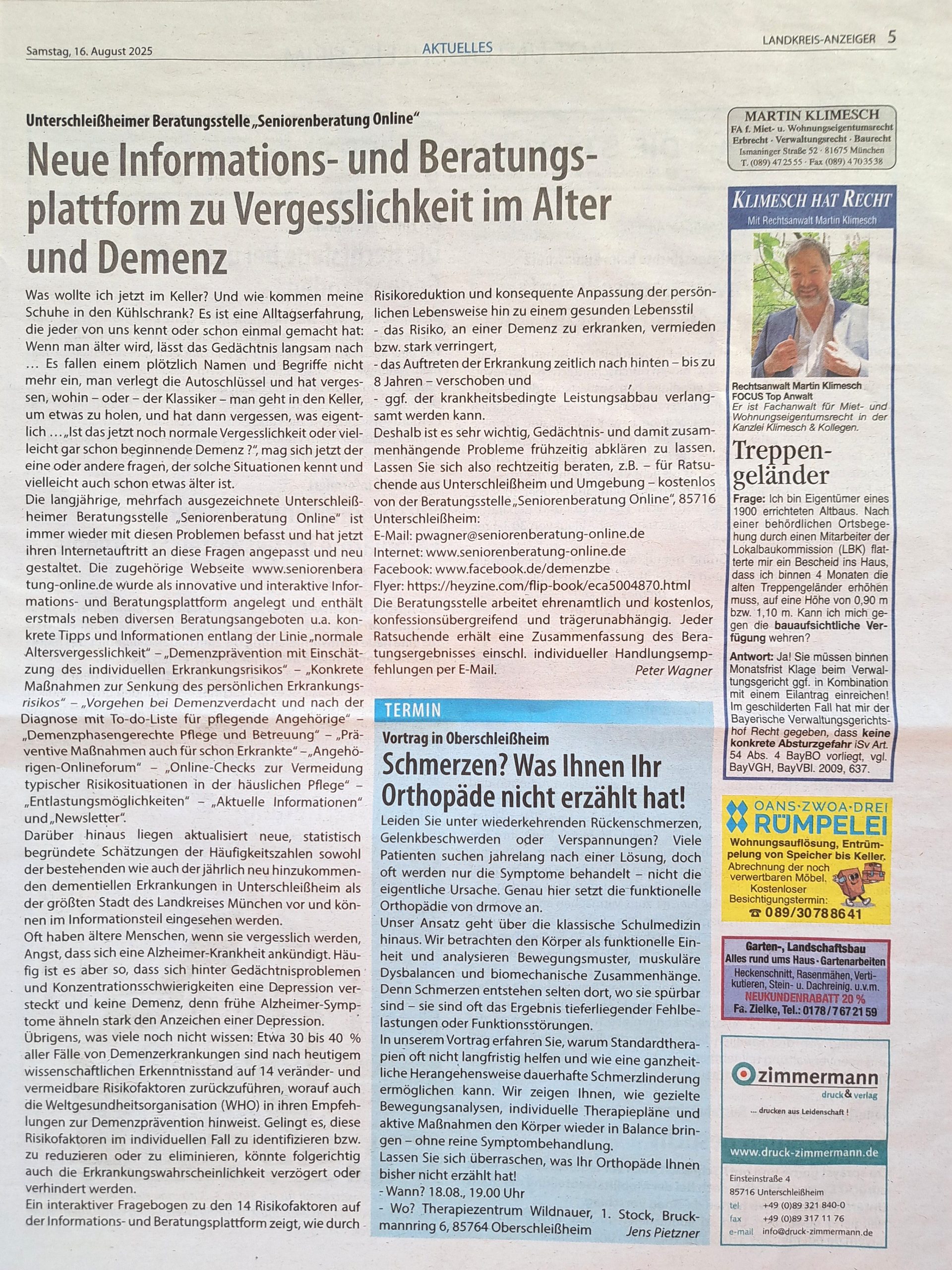 Presse: Münchner Merkur; Lohhofer Landkreisanzeiger - Seniorenberatung Online erhält Auszeichnung Anfang Dezember 2025 :